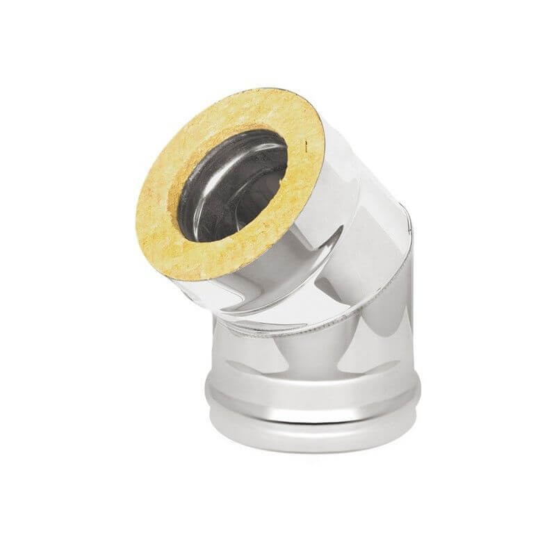 Сэндвич-колено используется для изменения направления труб дымохода на угол 45°. Изготовлено из нержавеющей стали. Изготовлено из нержавеющей стали толщиной 0,8 мм и 0,5 мм.