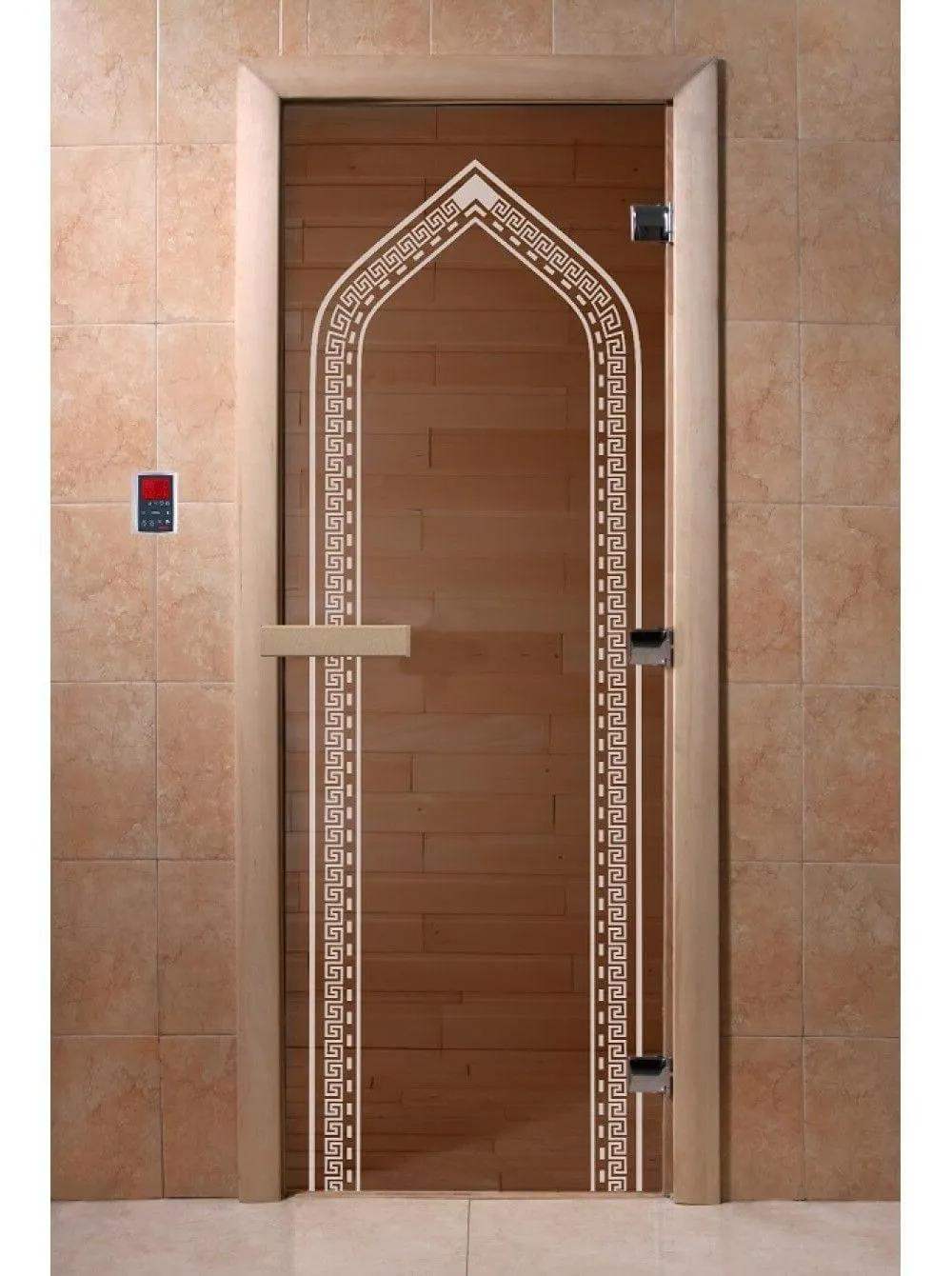 Стеклянная дверь для бани и сауны с рисунком АРКА, коробка осина, бронза, 8 мм, 3 петли хром, квадратные 2000х800 мм (по коробке)