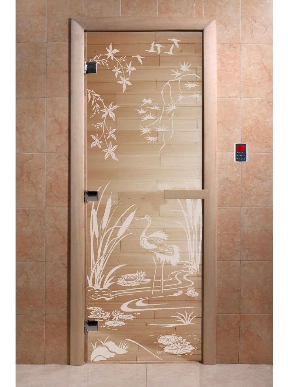Стеклянная дверь для бани и сауны с рисунком КАМЫШОВЫЙ РАЙ, коробка осина, прозрачная, 8 мм, 3 петли хром, квадратные 1900х700 мм (по коробке)