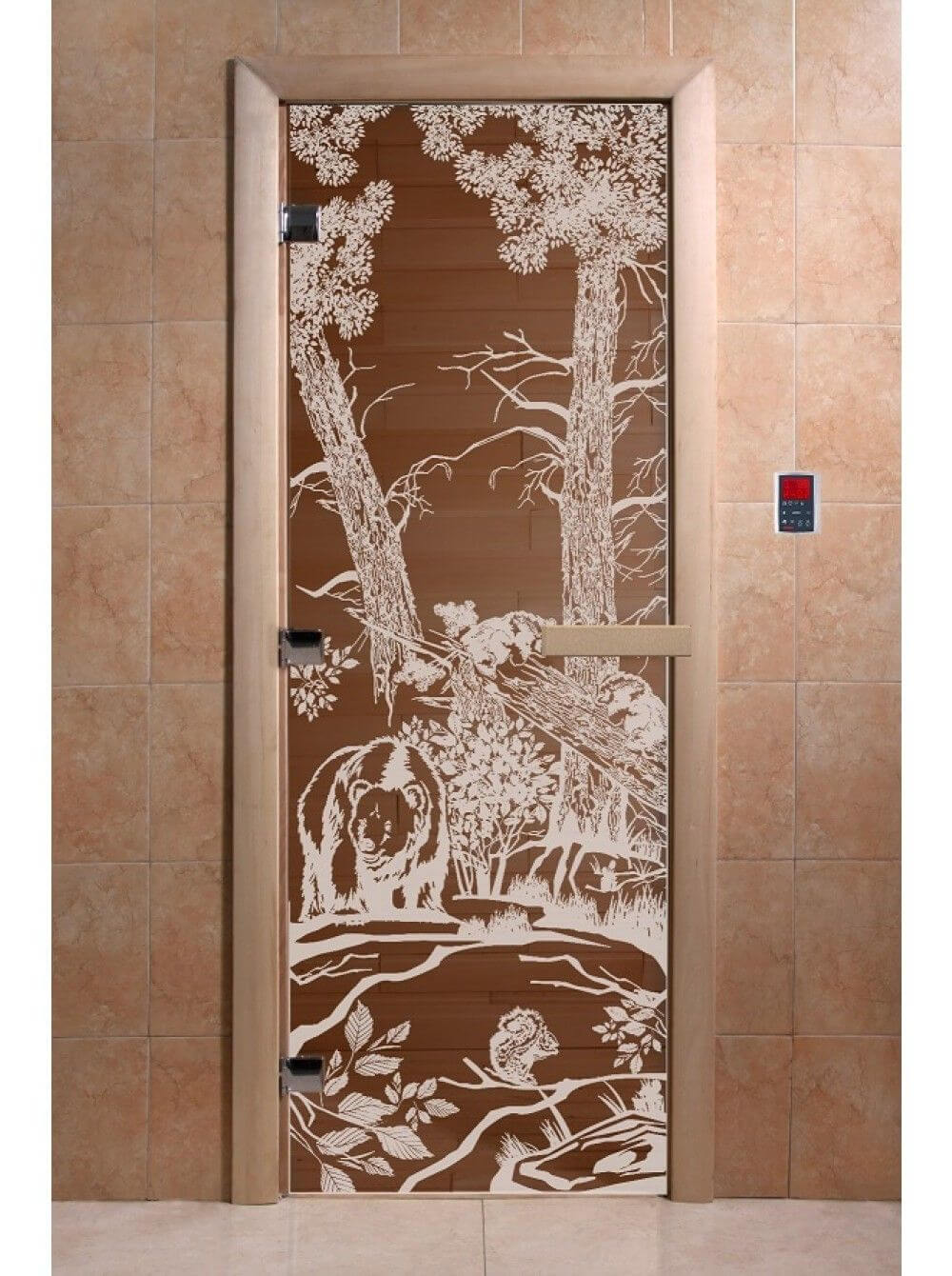 Стеклянная дверь для бани и сауны с рисунком МИШКИ, коробка осина, бронза, 8 мм, 3 петли хром, квадратные 1900х700 мм (по коробке)