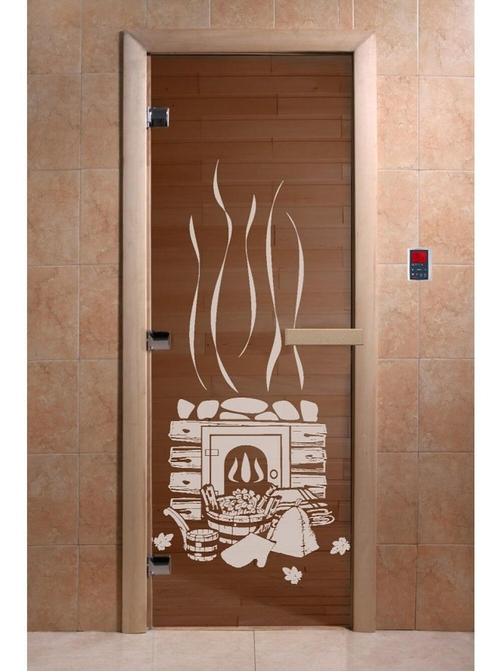 Стеклянная дверь для сауны БАНЬКА, осина, бронза, 8 мм, 3 петли хром, квадр, 1900х700 мм (по коробке)